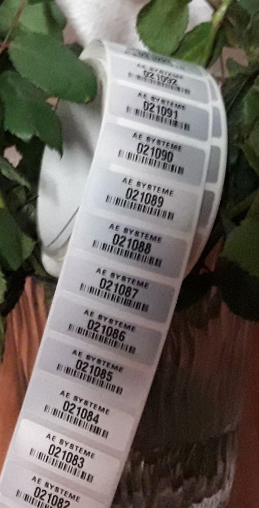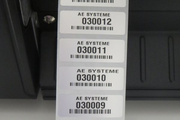 Als Etikettengröße empfehlen wir 40 x 14 mm. Druckverfahren ist Thermotransfer, damit die Etiketten auch unter widrigen Umständen haften. Selbstverständlich sind auch beliebige andere Designs und Etikettengrößen möglich, z.B. auch QR Codes. Als Lesegeräte werden professionelle Handheld Scanner empfohlen, da Smartphone Kameras QR Code besser lesen können als herkömmlichen Barcode.